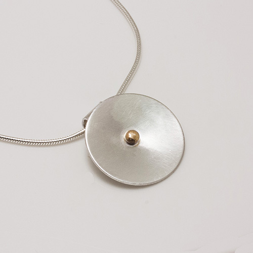 Simply elegant, this necklace was inspired by the beautiful simplicity of the cosmos! A slightly domed round of sterling silver has been hand-brushed to matte perfection and then dotted with a 14k gold orb.