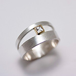 The beauty of the white sapphire is as infinite as the universe! This brushed matte sterling ring bears a 3 mm square princess cut white sapphire in a 14k gold setting held in its orbit between two silver bands.