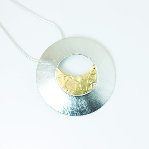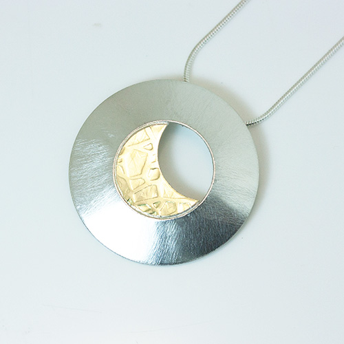 This 1 1/4" minimalist pendant is an open circle of polished textured silver that holds a crescent of textured 18k gold bimetal set at an angle. The snake chain runs through a small tube on the back of the pendant.