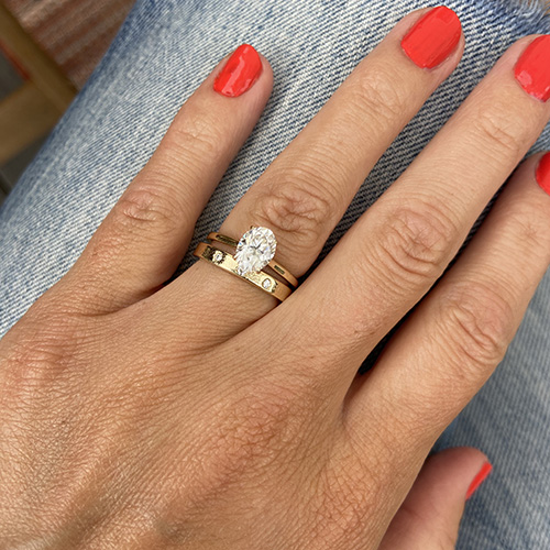 A young woman called me after seeing my rings at a local gallery. She wanted a wedding band that would coordinate with her lovely engagement ring, a beautiful oval moissanite, but could also be worn by itself. She chose a design with 3 moissanites, with embossing between the stones. She wrote me: