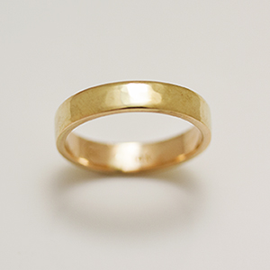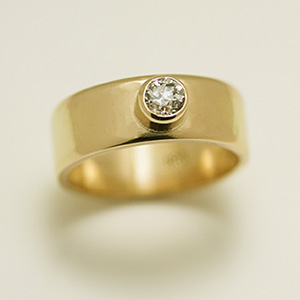 I met with a couple who are planning their wedding. The bride-to-be didn't want a traditional engagement and wedding ring set. She wanted just one diamond ring. She liked the look of a wider band; it gives the ring a very substantial feel and plays up her diamond very well. The groom wanted a traditional band, except with a hammered surface to give it a more textural feel.